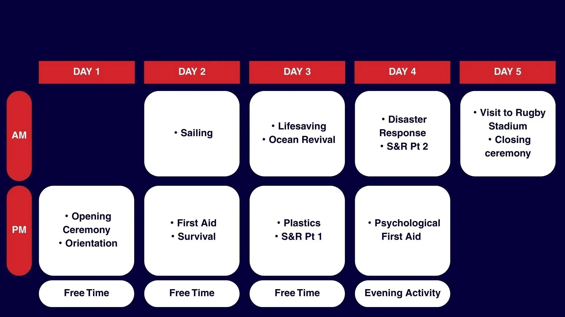 下記のプログラムスケジュールは過去のサマーキャンプに基づいた一例です。アクティビティ内容などは、天気やその他の状況により変更になる可能性があります。